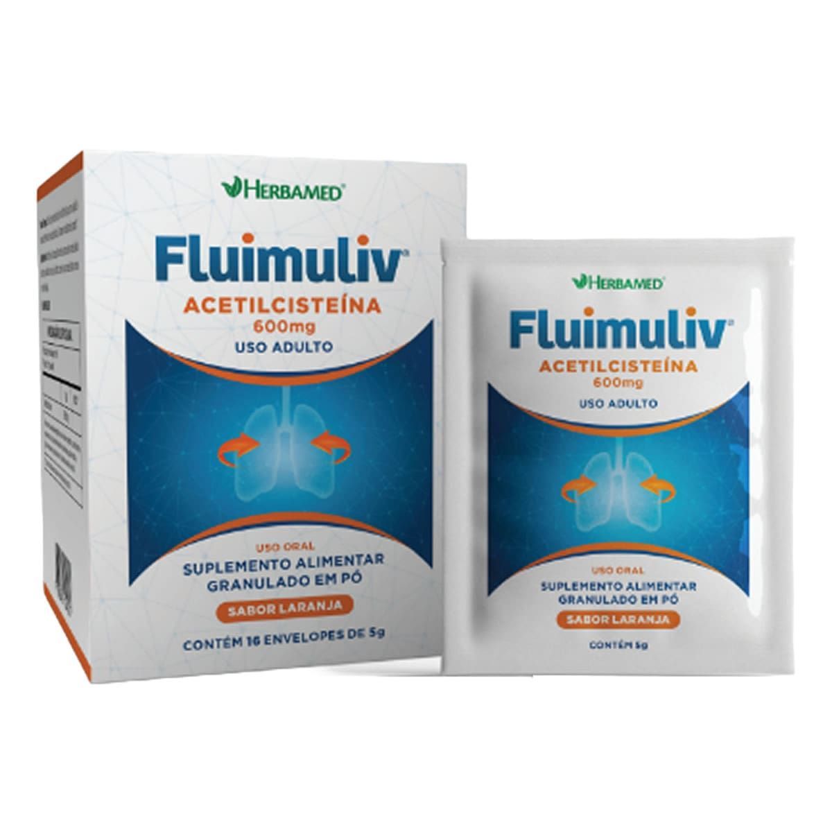 O Fluimuliv Granulado (600mg) da Herbamed é um suplemento alimentar de acetilcisteína, apresentado em envelopes de 5g com sabor de laranja. Indicado para auxiliar na expectoração e alívio de tosse produtiva com catarro, facilita a respiração. Deve ser dissolvido em água, com dose de 1 envelope ao dia.
