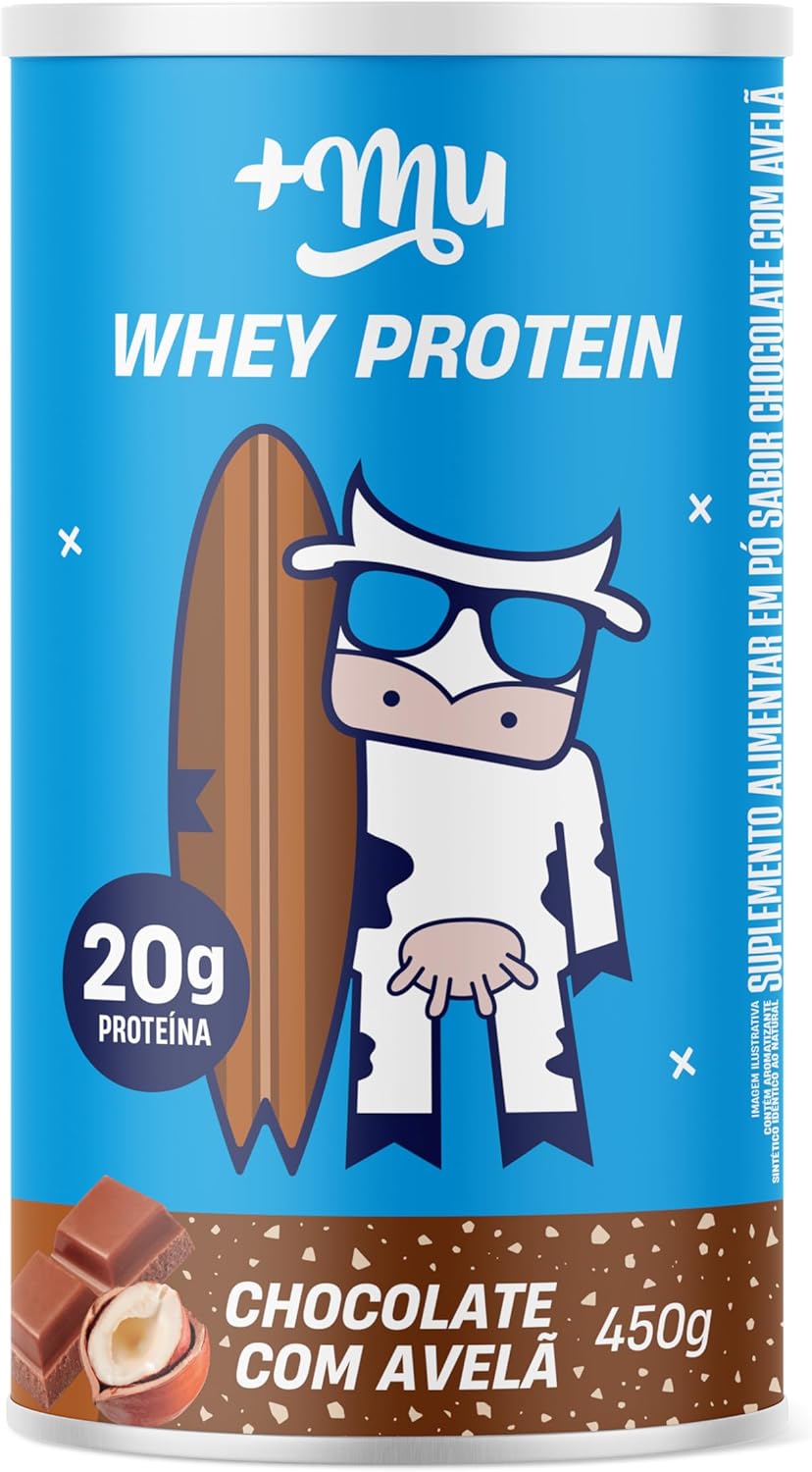 Cada pote vem com 450g de Whey Concentrado Mais Mu sabor Chocolate com avelã e contém cerca de 12 doses do produto.
